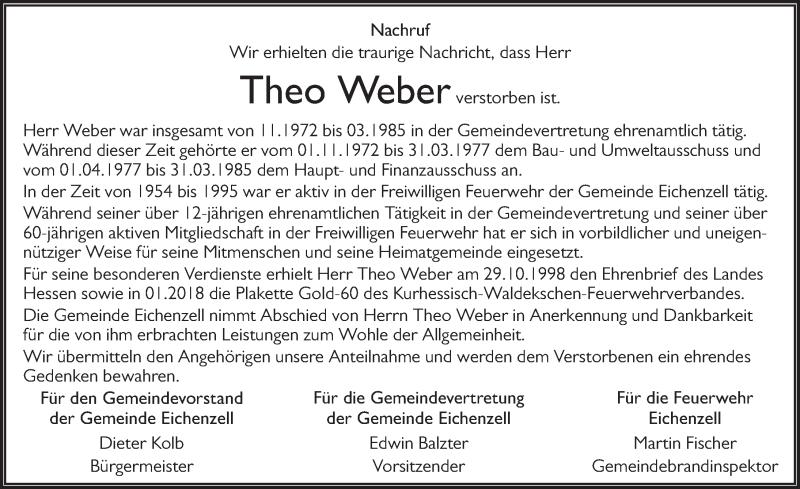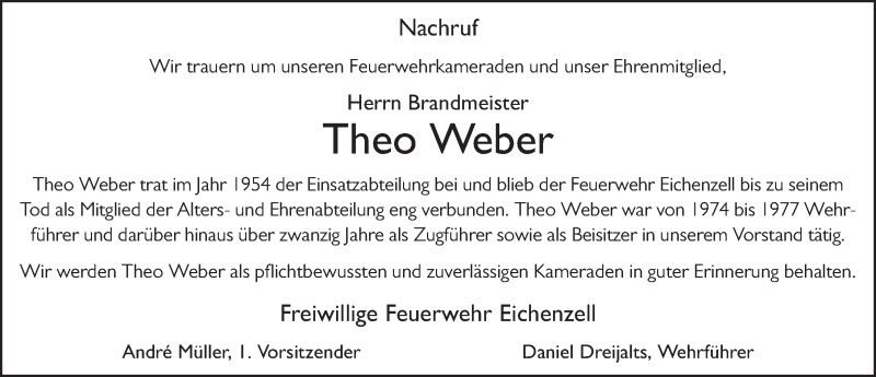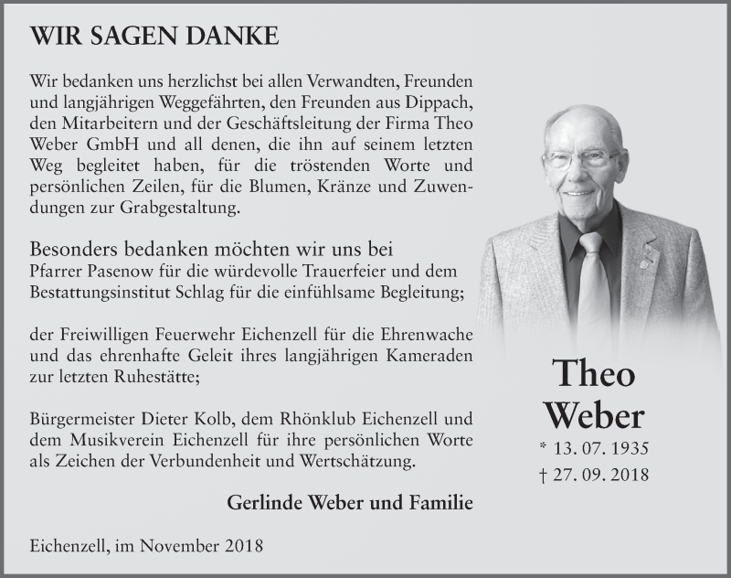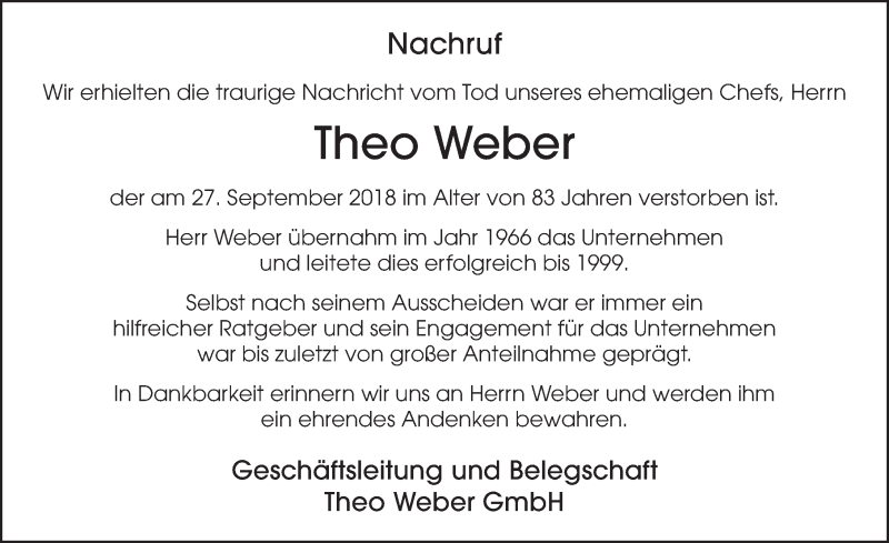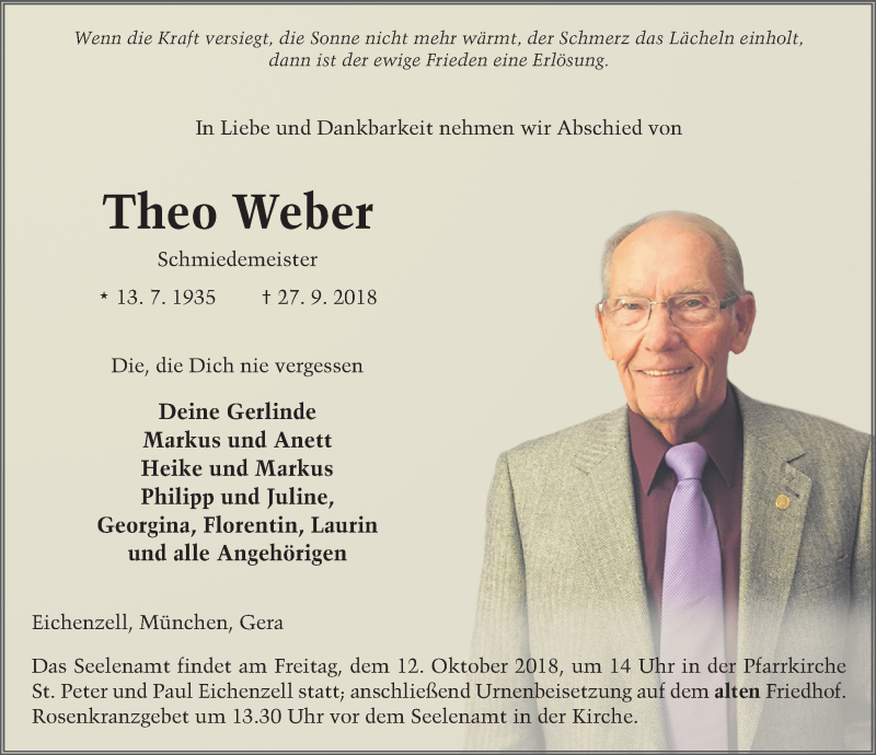 Hier finden Sie alle Traueranzeigen aus der Zeitung, die bisher für Theo Weber erschienen sind. Weitere Traueranzeigen, die in der Zeitung erscheinen, werden hier ebenfalls aufgelistet
