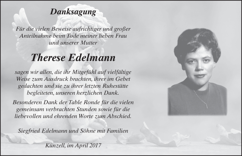 Hier finden Sie alle Traueranzeigen aus der Zeitung, die bisher für Therese Edelmann erschienen sind. Weitere Traueranzeigen, die in der Zeitung erscheinen, werden hier ebenfalls aufgelistet