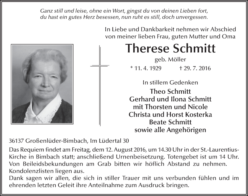 Hier finden Sie alle Traueranzeigen aus der Zeitung, die bisher für Therese Schmitt erschienen sind. Weitere Traueranzeigen, die in der Zeitung erscheinen, werden hier ebenfalls aufgelistet