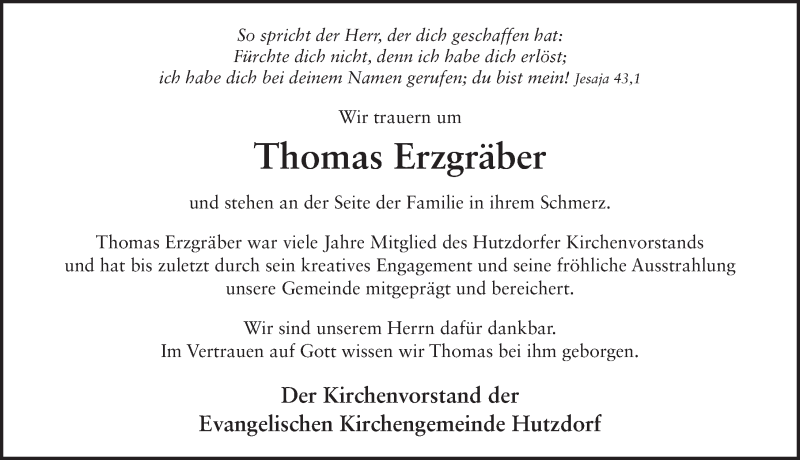 Hier finden Sie alle Traueranzeigen aus der Zeitung, die bisher für Thomas Erzgräber erschienen sind. Weitere Traueranzeigen, die in der Zeitung erscheinen, werden hier ebenfalls aufgelistet