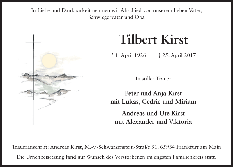 Hier finden Sie alle Traueranzeigen aus der Zeitung, die bisher für Tilbert Kirst erschienen sind. Weitere Traueranzeigen, die in der Zeitung erscheinen, werden hier ebenfalls aufgelistet