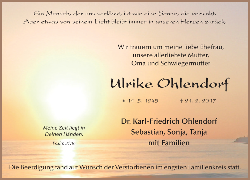 Hier finden Sie alle Traueranzeigen aus der Zeitung, die bisher für Ulrike Ohlendorf erschienen sind. Weitere Traueranzeigen, die in der Zeitung erscheinen, werden hier ebenfalls aufgelistet