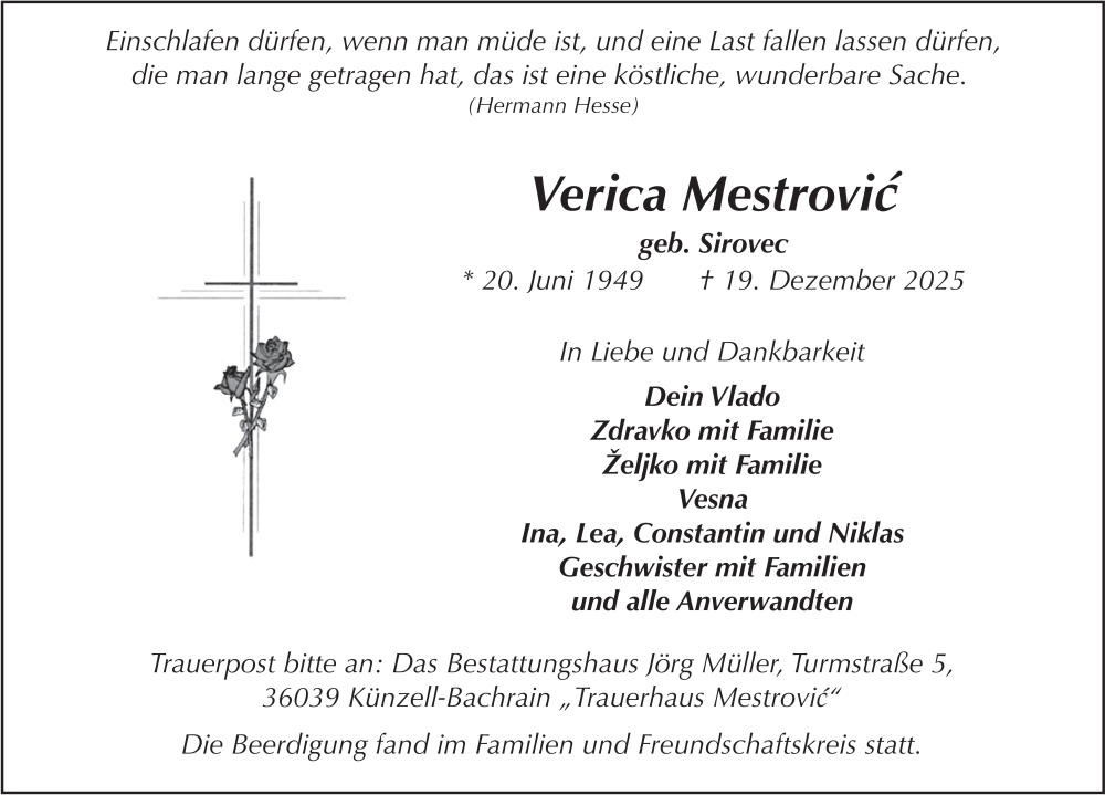 Hier finden Sie alle Traueranzeigen aus der Zeitung, die bisher für Verica Mestrovic erschienen sind. Weitere Traueranzeigen, die in der Zeitung erscheinen, werden hier ebenfalls aufgelistet