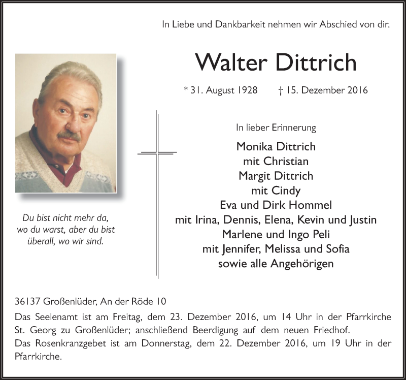 Hier finden Sie alle Traueranzeigen aus der Zeitung, die bisher für Walter Dittrich erschienen sind. Weitere Traueranzeigen, die in der Zeitung erscheinen, werden hier ebenfalls aufgelistet