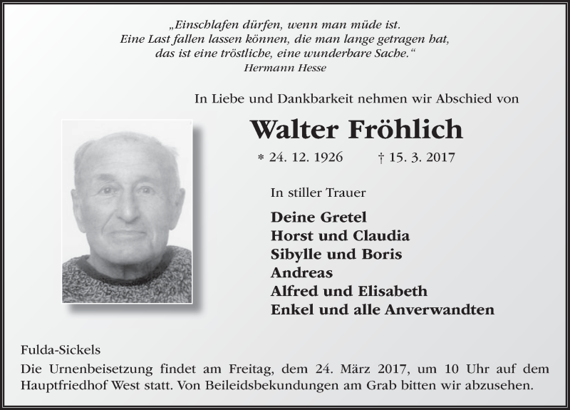 Hier finden Sie alle Traueranzeigen aus der Zeitung, die bisher für Walter Fröhlich erschienen sind. Weitere Traueranzeigen, die in der Zeitung erscheinen, werden hier ebenfalls aufgelistet