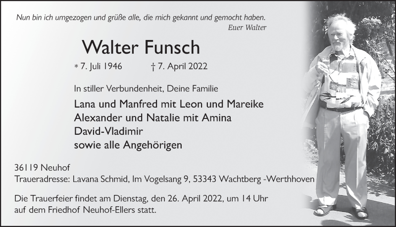 Hier finden Sie alle Traueranzeigen aus der Zeitung, die bisher für Walter Funsch erschienen sind. Weitere Traueranzeigen, die in der Zeitung erscheinen, werden hier ebenfalls aufgelistet