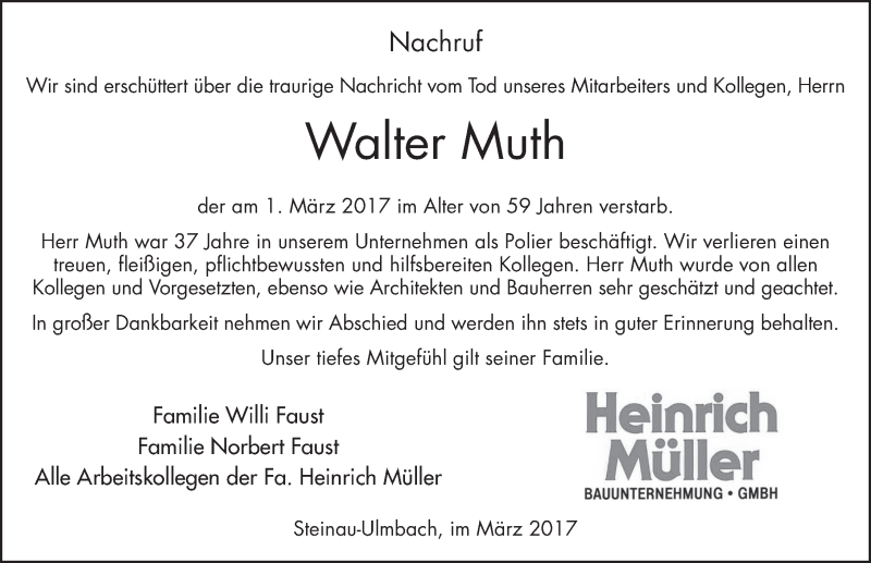 Hier finden Sie alle Traueranzeigen aus der Zeitung, die bisher für Walter Muth erschienen sind. Weitere Traueranzeigen, die in der Zeitung erscheinen, werden hier ebenfalls aufgelistet