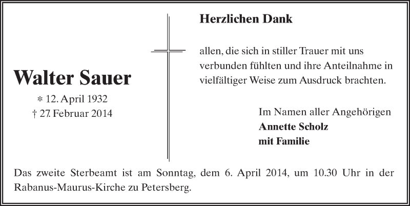 Hier finden Sie alle Traueranzeigen aus der Zeitung, die bisher für Walter Sauer erschienen sind. Weitere Traueranzeigen, die in der Zeitung erscheinen, werden hier ebenfalls aufgelistet