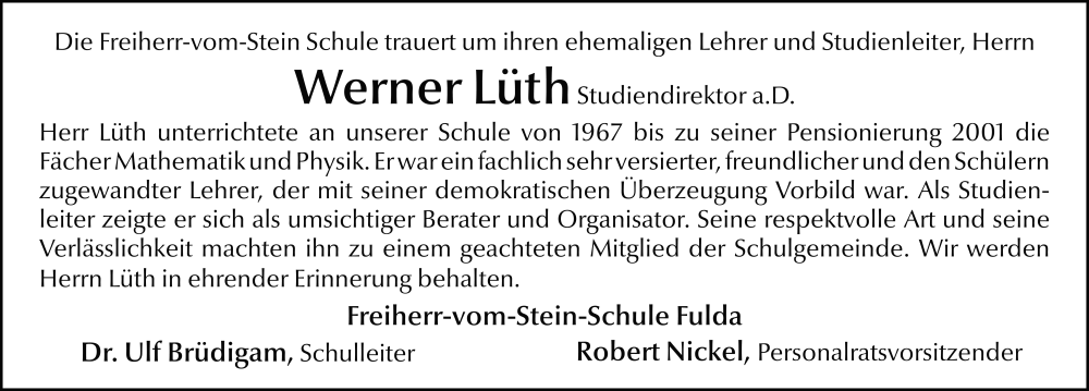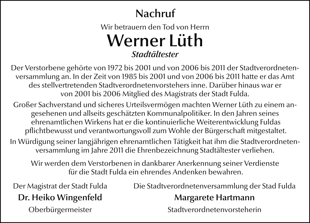 Hier finden Sie alle Traueranzeigen aus der Zeitung, die bisher für Werner Lüth erschienen sind. Weitere Traueranzeigen, die in der Zeitung erscheinen, werden hier ebenfalls aufgelistet