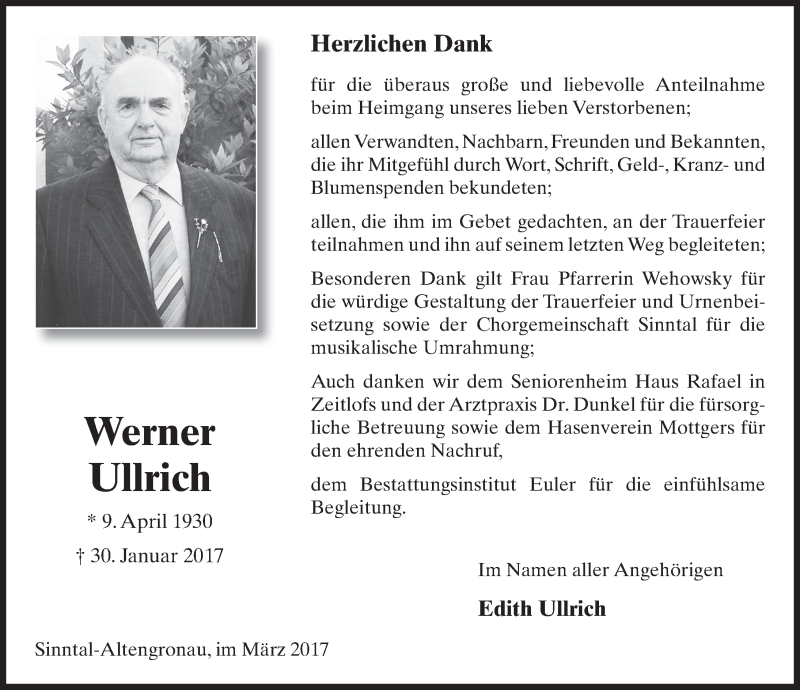 Hier finden Sie alle Traueranzeigen aus der Zeitung, die bisher für Werner Ullrich erschienen sind. Weitere Traueranzeigen, die in der Zeitung erscheinen, werden hier ebenfalls aufgelistet
