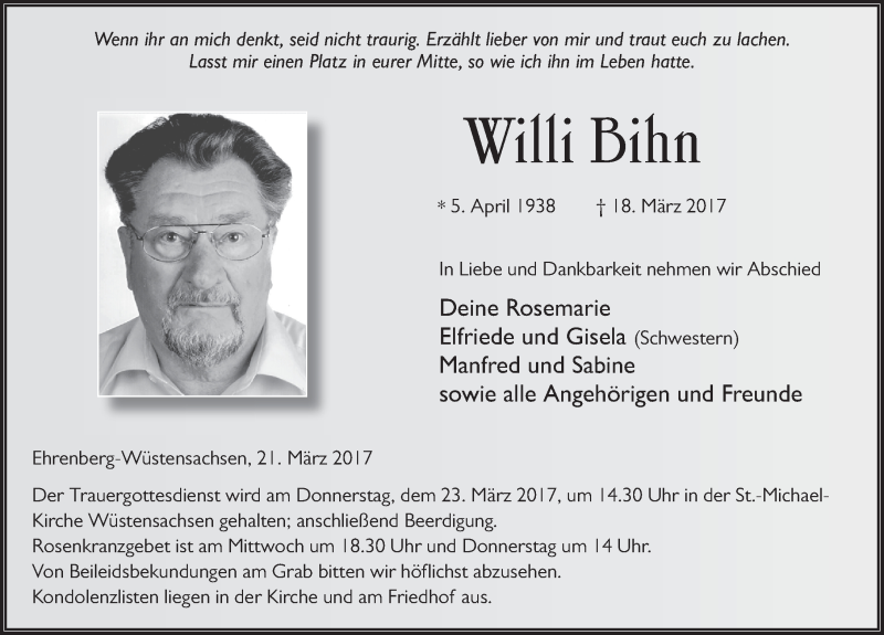 Hier finden Sie alle Traueranzeigen aus der Zeitung, die bisher für Willi Bihn erschienen sind. Weitere Traueranzeigen, die in der Zeitung erscheinen, werden hier ebenfalls aufgelistet