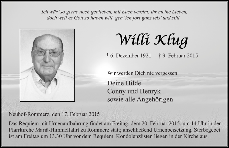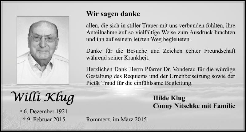 Hier finden Sie alle Traueranzeigen aus der Zeitung, die bisher für Willi Klug erschienen sind. Weitere Traueranzeigen, die in der Zeitung erscheinen, werden hier ebenfalls aufgelistet