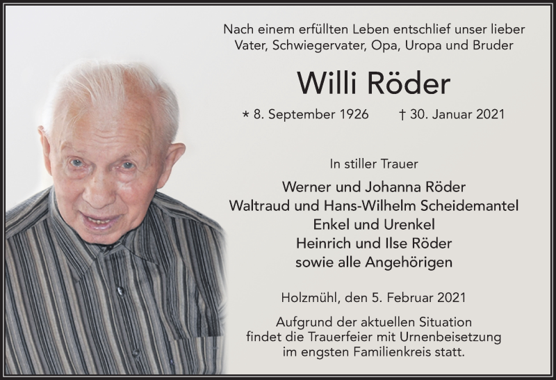 Hier finden Sie alle Traueranzeigen aus der Zeitung, die bisher für Willi Röder erschienen sind. Weitere Traueranzeigen, die in der Zeitung erscheinen, werden hier ebenfalls aufgelistet