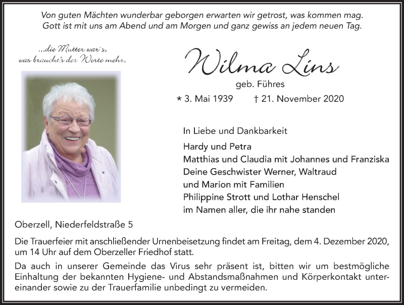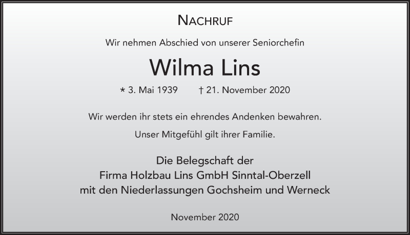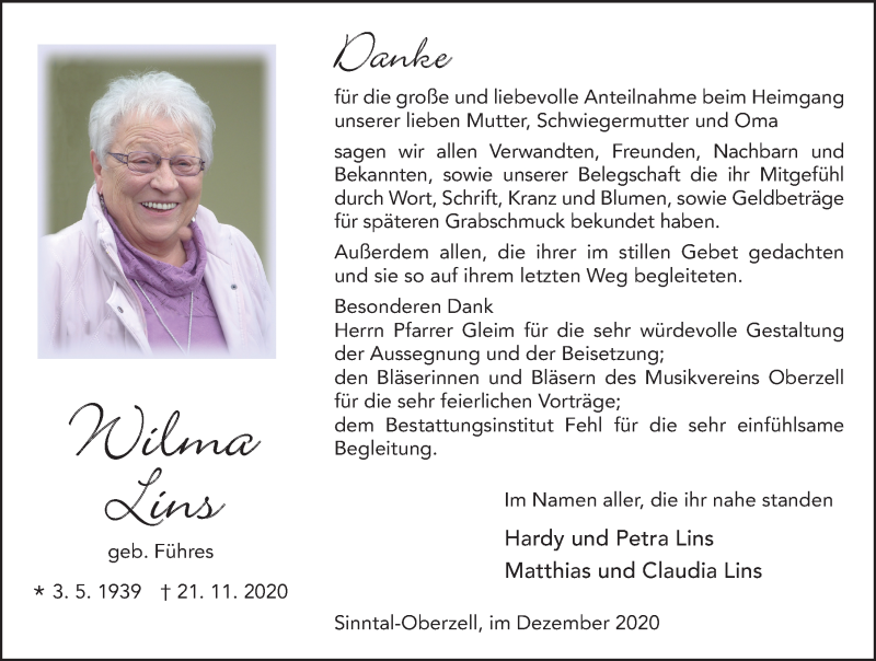 Hier finden Sie alle Traueranzeigen aus der Zeitung, die bisher für Wilma Lins erschienen sind. Weitere Traueranzeigen, die in der Zeitung erscheinen, werden hier ebenfalls aufgelistet