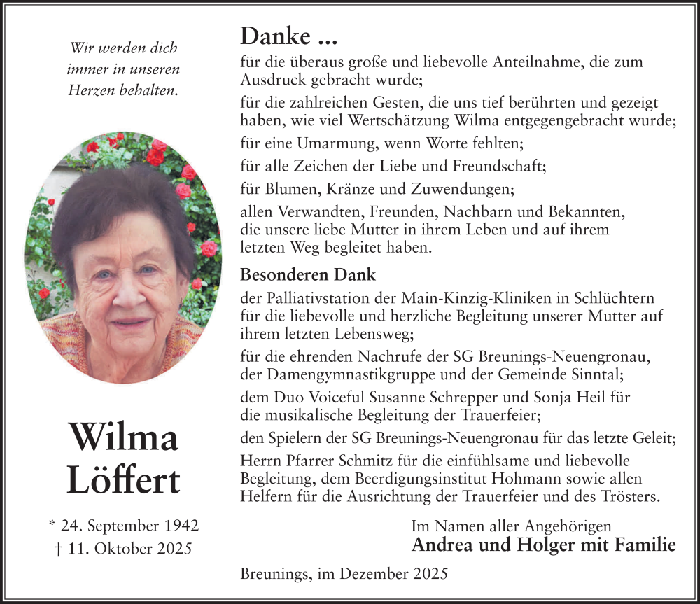 Hier finden Sie alle Traueranzeigen aus der Zeitung, die bisher für Wilma Löffert erschienen sind. Weitere Traueranzeigen, die in der Zeitung erscheinen, werden hier ebenfalls aufgelistet