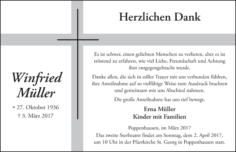 Hier finden Sie alle Traueranzeigen aus der Zeitung, die bisher für Winfried Müller erschienen sind. Weitere Traueranzeigen, die in der Zeitung erscheinen, werden hier ebenfalls aufgelistet